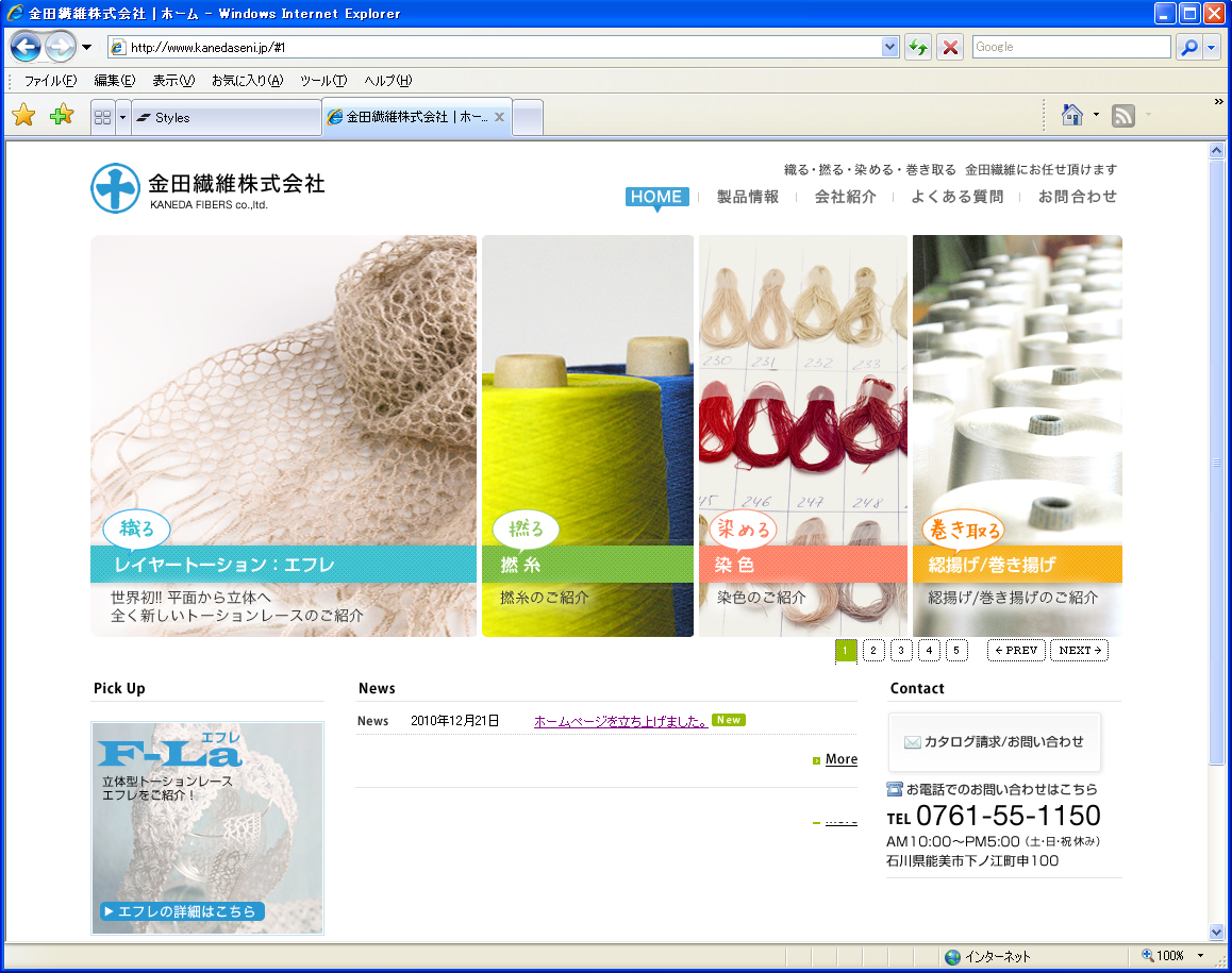 本日、金田繊維株式会社のホームページを立ち上げました。 本サイトでは、製品情報や会社情報はもちろん、弊社が新たに提案する『レイヤートーションレース(エフレ)』の掲載していきます。 是非ご覧になってください。 今後とも、金田繊維株式会社をよろしくお願いいたします。